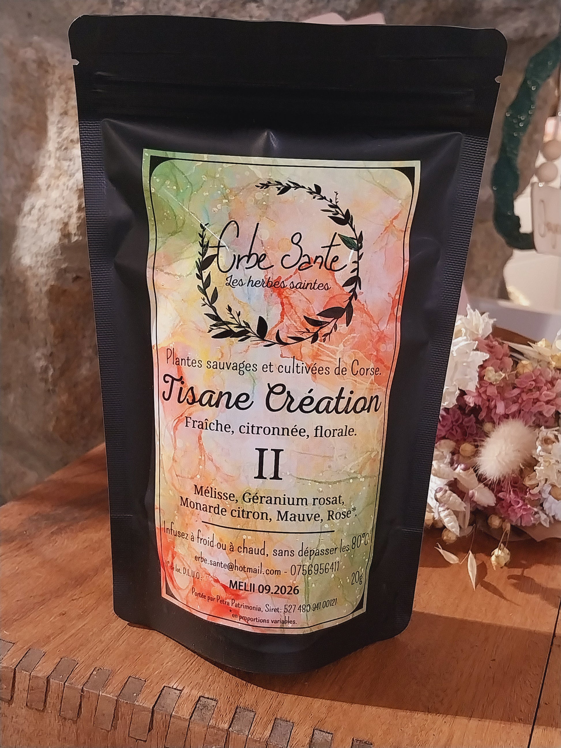 Découvrez la Tisane Création II, un mélange délicat de plantes corses cueillies et cultivées avec soin par Erbe Sante, marque artisanale spécialisée dans les herbes sauvages de l’île.